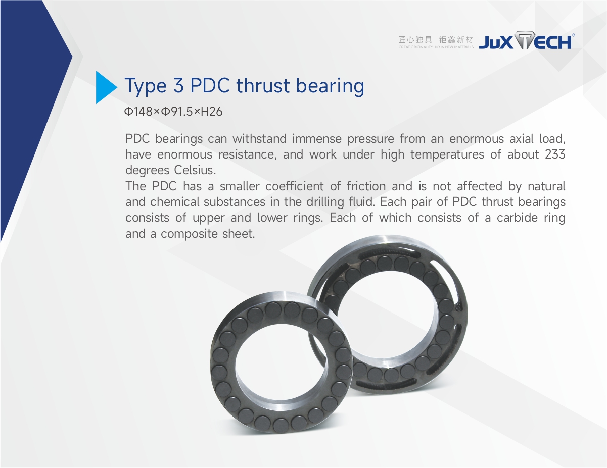 • The specifications:φ124 xφ80 x H26 φ148 xφ91.5 x H26 PDC bearings can withstand immense pressure from an enormous axial load, have enormous resistance, and work under high temperatures of about 233 degrees Celsius.